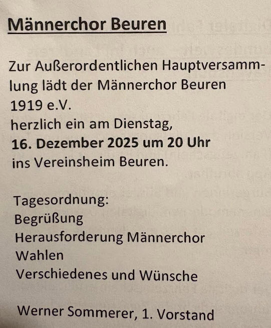 Sie singen gerne in der Badewanne? Super, dann kommen Sie doch zu unseren Chorproben. Da werden Sie gehört. Diese sind jeden Dienstag 20:15 Uhr in unserem Probenraum in der Festhalle Beuren.